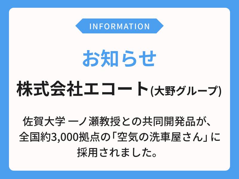 株式会社エコートより 佐賀大学 一ノ瀬教授との共同開発品が、全国約3,000拠点の「空気の洗車屋さん」に採用されました。